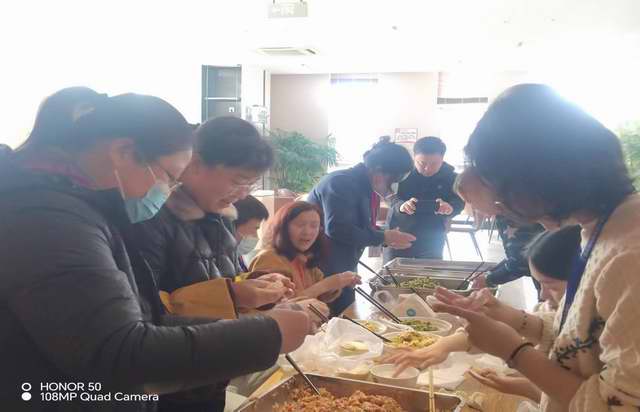 学校后勤处提前给支部备好了猪肉芹菜馅、猪肉白菜馅、羊肉洋葱馅、鸡蛋韭菜馅和饺子皮等材料,大家欢聚一堂,各显其能,包出各式各样的水饺。有鱼形饺、元宝饺、月牙饺、冠状饺;就算包的饺子没有那么饱满精致,但寓意满满。大家一边包着饺子,一边唠唠家常,交流包饺子的经验心得,现场欢声笑语,气氛融融。不一会儿工夫,桌子上就摆满了饺子。小小的饺子,带来一份相聚的温暖,驱赶了冬日的寒意,包进了一年所想、所思,包进了一起走过的记忆,包进了畅想和期盼。暖暖的情,浓浓的意,特别有爱的味道。