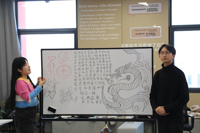 为了确保这次线上交流课堂的顺利进行,双方学校的学生都提前查阅典故、绘制海报、制作道具、录制视频等,做了充分的准备。课堂上,同学们分享了各自国家新年的由来、传统、特色食物、风俗等,并展开了热烈的讨论。值得一提的是,在活动中,我校俄语班的学生展现出了出色的语言能力和文化素养,赢得了国立社会人文大学学生的高度赞誉。