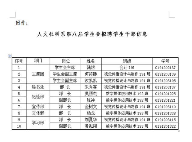 为进一步加强学生会组织建设,切实加强学生干部队伍建设,充分发挥学生自我教育、自我服务、自我管理和自我监督的作用,促进学生会工作的全面发展,本着“公平、公正、公开、竞争、择优”的原则,人文社科系学生会组织开展了2020年主要学生干部换届竞聘工作,通过学生自主报名、组织推荐、录制视频、资格审查、线上竞选答辩、综合考察等环节,结合学生日常工作能力表现、征集有关教师、辅导员意见后,经研究,决定拟聘陆煜等10名同学为人文社科系第八届学生会主要学生干部。