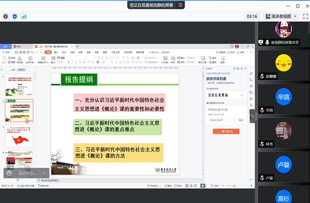 2021年11月9日下午1:30,思政中心利用腾讯会议召开线上线下教学研讨会。会议的主题为江苏省高等学校《毛泽东思想和中国特色社会主义理论体系概论》集体备课会培训分享,由杨劲静老师主讲。