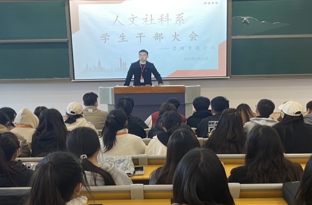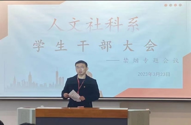 为进一步落实《乐玩体育校园禁烟管理制度》、《乐玩体育2023年禁烟工作实施方案》,提高学生干部的思想意识,增强禁烟工作的积极性,带动周围同学进一步实施禁烟管理制度,2023年3月23日,人文社科系在善学楼102召开系部学生干部大会——禁烟专题会。大会由杨军老师主讲,人文社科系全体学生干部参加。
