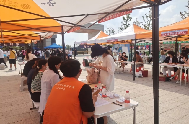 在新生报到前一天学校已开始布置展棚和摆放桌椅、牌子、宣传页,各项准备工作有序开展。新生报到当天各组织严格遵守疫情防控需要,志愿者、老师、服务人员均佩戴N95口罩,并在各展棚内设置防疫专员一名,负责按防疫要求提醒大家佩戴口罩、进行手部消毒等。