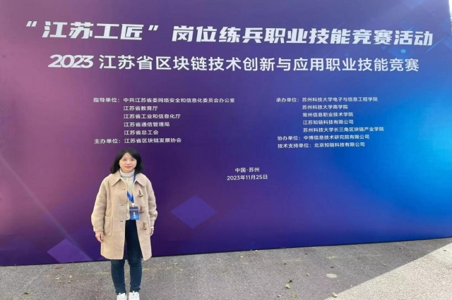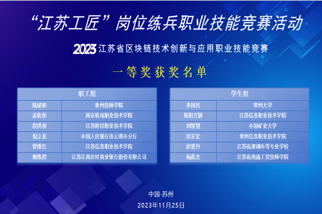 2023年11月25日上午,“江苏工匠”岗位练兵职业技能竞赛——2023年江苏省区块链技术创新与应用职业技能竞赛在苏州圆满落幕,来自省内院校、企事业单位的总计2000余人参加了本次竞赛。经过市赛选拔,我校孟秋彤老师进入决赛,最终以职工组第二名的成绩获得本次竞赛的一等奖,并被授予“江苏省五一创新能手”称号、“江苏省技术能手”称号,同时,乐玩体育被授予优秀组织奖。