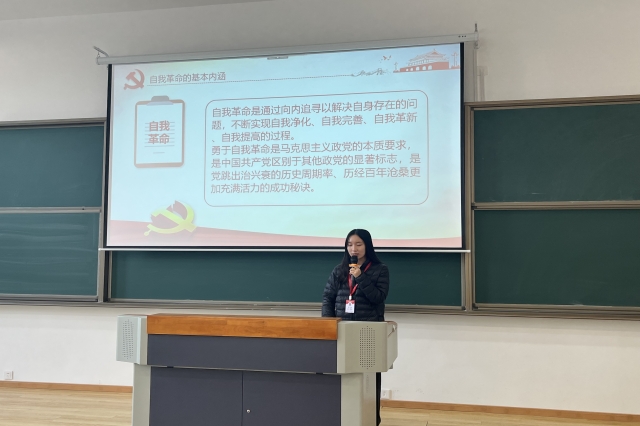 李老师首先强调,在党的二十大报告中指出,全面从严治党永远在路上,党的自我革命永远在路上,决不能有松劲歇脚、疲劳厌战的情绪,必须持之以恒推进全面从严治党,深入推进新时代党的建设新的伟大工程,以党的自我革命引领社会革命。她认为这一重要论述,彰显了我们党一以贯之坚持自我革命的坚定决心,标志着我们党对自身建设规律和执政规律的认识达到了新高度。随后她围绕“中国共产党自我革命的发展历程”“中国共产党自我革命的基本经验”等方面带领大家进行细致地学习。