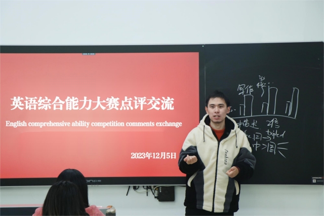 为进一步深化高职高专英语教学改革,落实立德树人根本任务,推动“三进”工作纵深发展,推进有家国情怀、有全球视野、有专业本领的高水平国际化人才培养,帮助学生增长见识、开拓视野、磨砺意志,成为时代需要、国家需要、行业需要的高素质“外国语”“中国心”人才,结合《学院技能竞赛三年行动计划》和“六个一行动计划”,人文社科系英语教研室依托英语第二课堂“蓝岛英”英语角于12月5日14:30—15:00举办了2023年英语综合能力大赛点评交流活动。校技能竞赛——英语综合能力大赛全体参赛成员齐聚一堂,全神贯注地倾听关于本次大赛的点评指导。