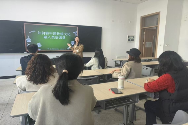 参会教师围绕主题展开了深入的讨论和交流,共同探讨了如何将中国传统文化与英语教学有机结合。冯素芹老师引导大家思考中国传统文化在英语课堂中的重要性。她指出,随着全球化的深入,英语已不仅仅是一门交流工具,更是展示本土文化的桥梁。大家一致认为,经典的中国诗歌不仅语言优美、含义深刻,还能够帮助学生感受中国语言的韵律美和文化内涵。同时,通过讲解中国传统节日的习俗和故事,提升学生的文化理解力。此外,如何利用中国传统艺术形式,如书法、剪纸、绘画等来激发学生的兴趣。在英语课堂上可以展示与这些艺术相关的词汇和表达方式,例如解释书法中的“字如其人”以及剪纸的象征意义等,从而让学生在学习英语的同时更好地了解中国传统艺术的内涵。