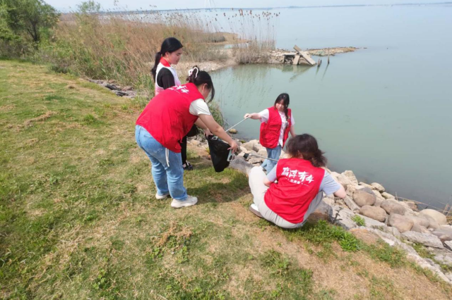 活动首站,志愿者们齐聚蒋山码头,手持垃圾夹与垃圾袋,分组沿固城湖滩涂展开净滩行动。废旧渔网、塑料瓶、泡沫碎屑、烟头等,志愿者们细致地清理每一处垃圾,同时向周边居民科普水域保护对生态平衡的重要性。“守护母亲河”的呼吁随湖风传递,化作点滴行动中的责任与担当。