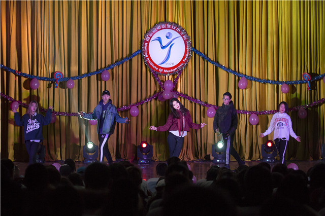 雄赳赳气昂昂,机电男儿当自强,一场震撼人心的武术表演向我们展示了炎黄子孙的武术精魂。而后信息系带来的《rap of china》引得场下一片欢呼。紧接着的《花样跳绳》《街舞表演》更是精彩纷呈。当天各个学生会主席也为在场观众带来了新年礼物,送出了新年祝福。小品《我是男一号》更是引得全场师生捧腹大笑,将气氛推向了高潮。最后吉他弹唱《安河桥》《等你回家》为大家呈现了一场听觉盛宴。