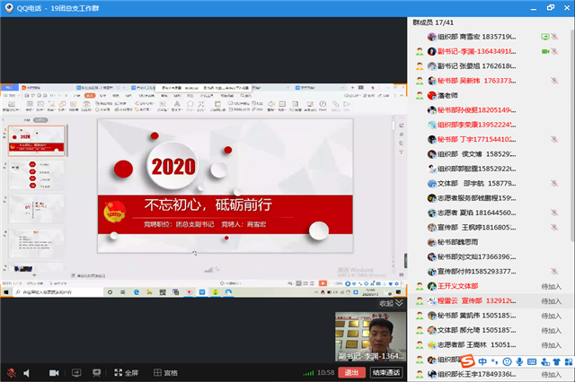 为加强团组织自身管理,提高团干队伍整体素质,为团总支提供有力的组织保障,并服务好团员青年。乐玩体育自动化工程系团总支二轮换届竞聘于2020年6月15日下午17:30在博学楼B301举行。因受疫情影响,本次竞聘选在线上举行。参加本次竞聘评委的有自动化工程系团总支书记潘久伟老师、2018级学生副书记和各部门部长。