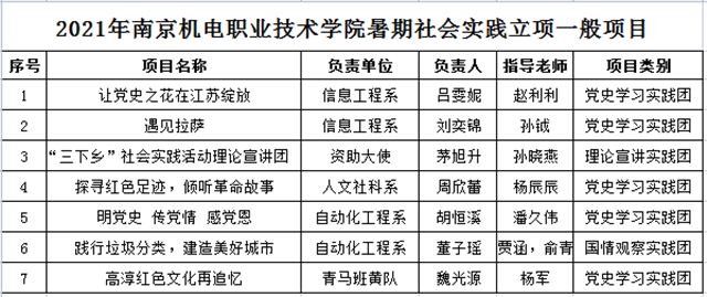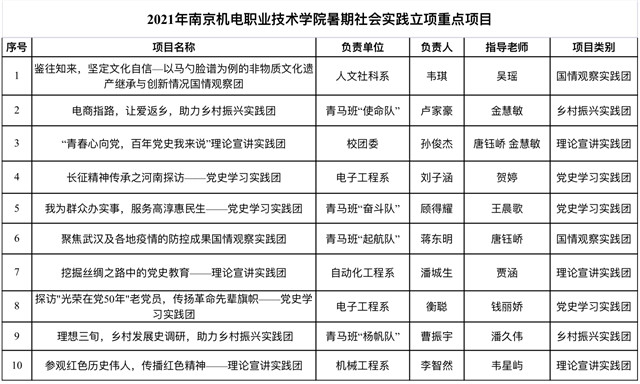 为深入学习宣传贯彻习近平新时代中国特色社会主义思想,贯彻落实习近平总书记关于青年工作的重要思想,引导和帮助广大青年学生上好与现实相结合的“大思政课”,在社会课堂中受教育、长才干、作贡献,在观察实践中学党史、强信念、跟党走,努力成为担当民族复兴大任的时代新人,以实际行动庆祝中国共产党成立100周年,按照团省委《关于开展2021年全省大中专学生志愿者暑期文化科技卫生“三下乡”社会实践活动的通知》相关要求,经自主申报,各团总支、青马班审核推荐,校级专家评审,确定以下10个项目为2021年乐玩体育暑期社会实践重点立项项目,7个项目为2021年乐玩体育暑期社会实践立项一般项目,并对立项的校级重点项目和一般项目进行经费支持,现公示如下: