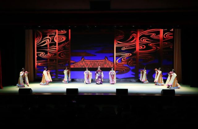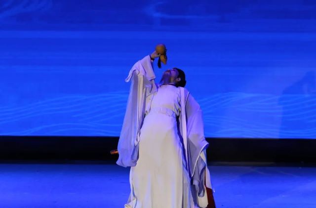 李白与孟浩然泛舟江上游金陵,吟诗作对,舞台的布置巧妙精美,加上舞台上灯光的点缀,将李白的潇洒不羁演绎的栩栩如生,淋漓尽致,同学们也被表演者深深吸引。正因有了以李白为代表的杰出诗人的铸就,才愈加绚烂多姿地映衬出大唐盛世之下的气象与魄力,文质与风骨,浪漫与奔放,自由与高贵,呼应着神来,气来,情来的隽永诗风和文化意境。