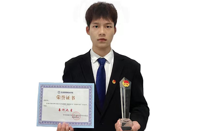 徐晨光,男,汉族、共青团员,毕业于湖北省荆州市洪湖市贺龙高级中学,来自信息工程系软件技术213班。现担任校团委助理、校团委宣传部副部长、班级副班长、团支部副书记、心理委员、墨客书法社社长、群星争鸣辩论社副社长、思齐苑301宿舍长。在校负责乐玩体育学工处微信公众号、乐玩体育官方抖音号运营工作。在乐玩体育学工处微信公众号打造【防疫锦囊】、【禁烟科普】、【学工周记】特色系列推文。【禁烟科普】系列推文的打造为我校师生的身体健康提供了可靠的理论支撑,拓展了我校健康教育的内涵,有力推动了校园精神文明建设。2022年度共参加校内为志愿服务60余次,累计服务时长超过500小时。