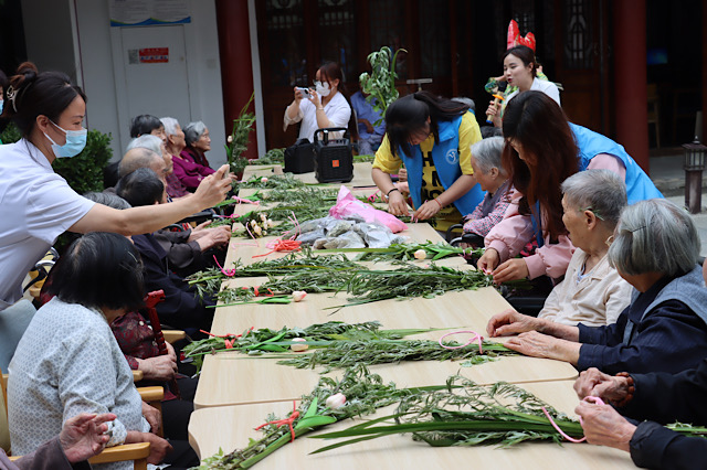 活动前期,由信息工程系团委书记沈歆岩及自动化系团委书记周笛共同对本次敬老院活动流程进行讲解,随后便带领志愿者们摆放桌椅,以便老人们入座。志愿者们在负责人的调动下分工明确,有的在摆放桌椅,以便老人更好的落座;有的在收拾艾草,有的在挑选花朵,有的在准备编织的绳子。随着准备工作的逐步落实,活动也就此展开,志愿者们先为老人们分发了艾草、粽叶、荷花,与老人们共同编织象征端午节"吉利"的花束,志愿者一边与老人共同编织花束,一边交流着端午节的习俗和故事,他们的到来为平日里稍显安静的护理院增添了许多欢声笑语。同时,志愿者与老人们亲切交谈,了解他们的日常生活和健康状况,并为他们送上精心准备的节日礼物。
