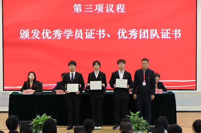 孙晓燕宣读了表彰决定并为第四期青马班结业学生代表颁发结业证书,学生工作处处长张宝中为优秀学员代表、优秀团队学员代表颁发荣誉证书,祝贺第四期青马班学员顺利结业。
