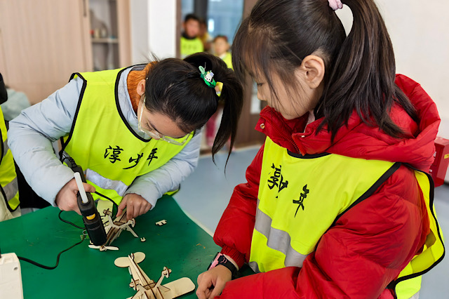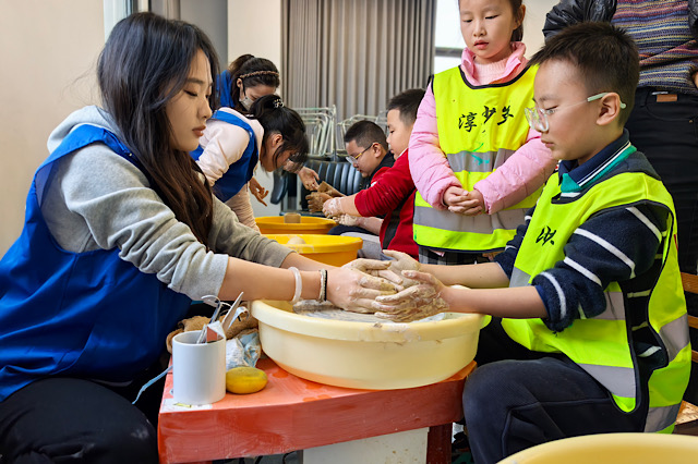 同学们还参观了非遗工坊,感悟中华优秀传统文化的独特魅力,参与了创客活动体验,在轻松愉快的氛围中增强动手能力,感受科技的魅力。在热转印体验中,孩子们挑选喜欢的图案,在蓝岛志愿者的帮助下通过热转印机器将图案转移到材料上,收获成功的喜悦。激光切割时,孩子们在讲解和协助下设计形状,看着激光切割出自己设计的作品,感受科技与创意结合的奇妙。陶艺制作环节,孩子们从一开始对陶泥的生疏把控,到逐渐掌握技巧,制作出碗碟、小动物等作品,沉浸在创作乐趣中。