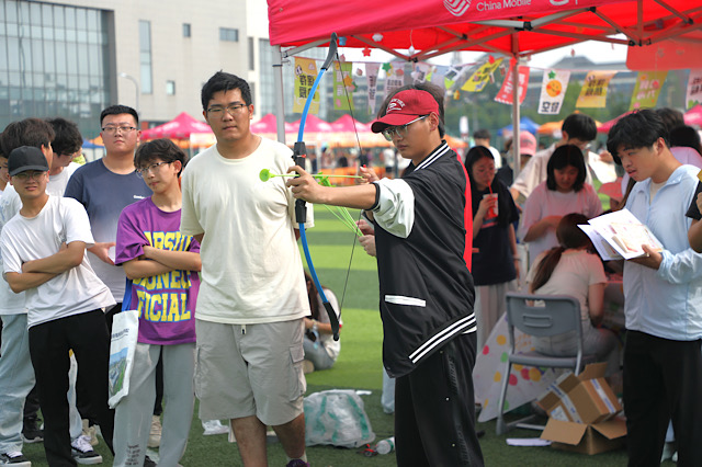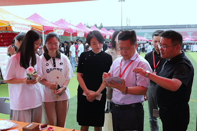 随着镜头移向操场,集市活动正如火如荼。文化展示区、互动体验区、科技展示区、心理集市、非遗集市、美食集市等区域有序分布,恰似一幅绚丽多彩的文化拼图。在非遗集市,师傅们如同技艺精湛的魔法师,现场展示高淳羽毛扇、木雕、糖画、版画等制作技艺,他们的双手上下翻飞,一件件精美的非遗作品逐渐成型,引得众多师生纷纷驻足,目光紧紧追随,满心好奇地亲身体验。互动体验区里,趣味游戏与抽奖环节交织,欢声笑语此起彼伏。同学们手持活动手册穿梭于各个摊位打卡集章,就像在收集文化碎片,去拼凑好那承载着非遗记忆的拼图。整个现场气氛热烈似火,大家的参与热情高涨如潮,完成一个又一个有趣的文化挑战。