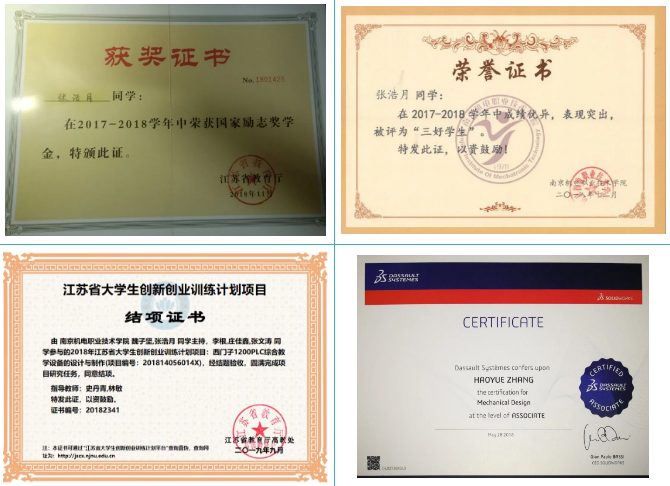 大学期间,专业成绩排名系部第二名,综合素质测评排名第一。在班级担任班长、院资助宣传大使,曾任乐玩体育单片机社团社长、蓝岛创客工坊学生负责人等。曾获得国家奖学金、国家励志奖学金、全国大学生挑战杯江苏赛区三等奖、中英STEAM江苏赛区最佳编程奖、江苏省大学生创新创业训练计划结项证书、学院奖学金、学院三好学生、学院优秀学生干部、学院优秀共青团员、社团之星、“一二九大合唱”二等奖、优秀标兵等荣誉称号。同时本人获得院优秀社会实践团队、优秀社会实践个人的荣誉称号、“欧帝杯”三创大赛优秀奖等。我所在班级在2018-2019学年被评为“江苏省省级优秀班集体”,“南京市五四红旗团支部”。