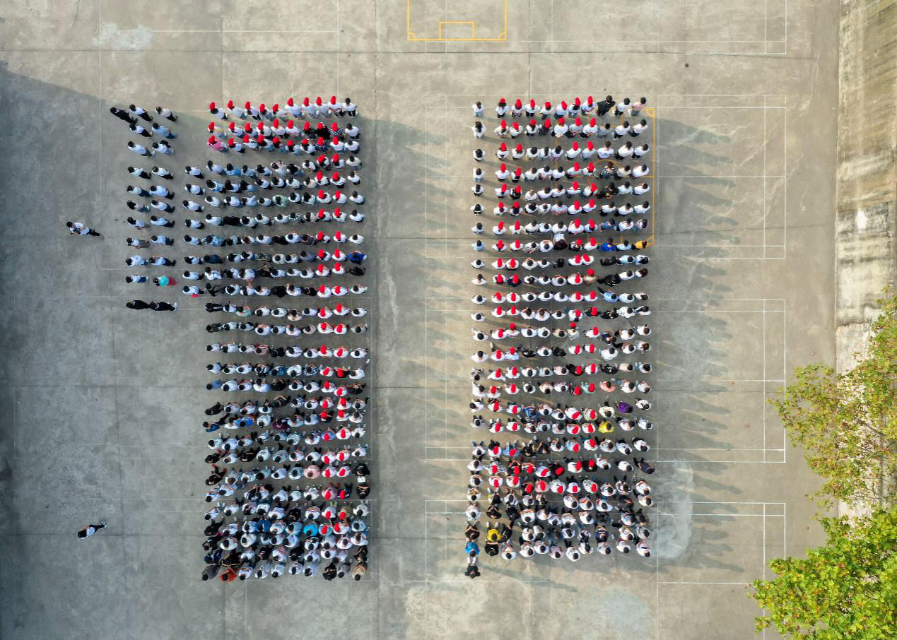 清晨七点,迎着初升的朝阳,乐玩体育650余名师生满怀崇敬之情聚集在操场,153名同学在队伍中用小红帽摆出“70”字样。