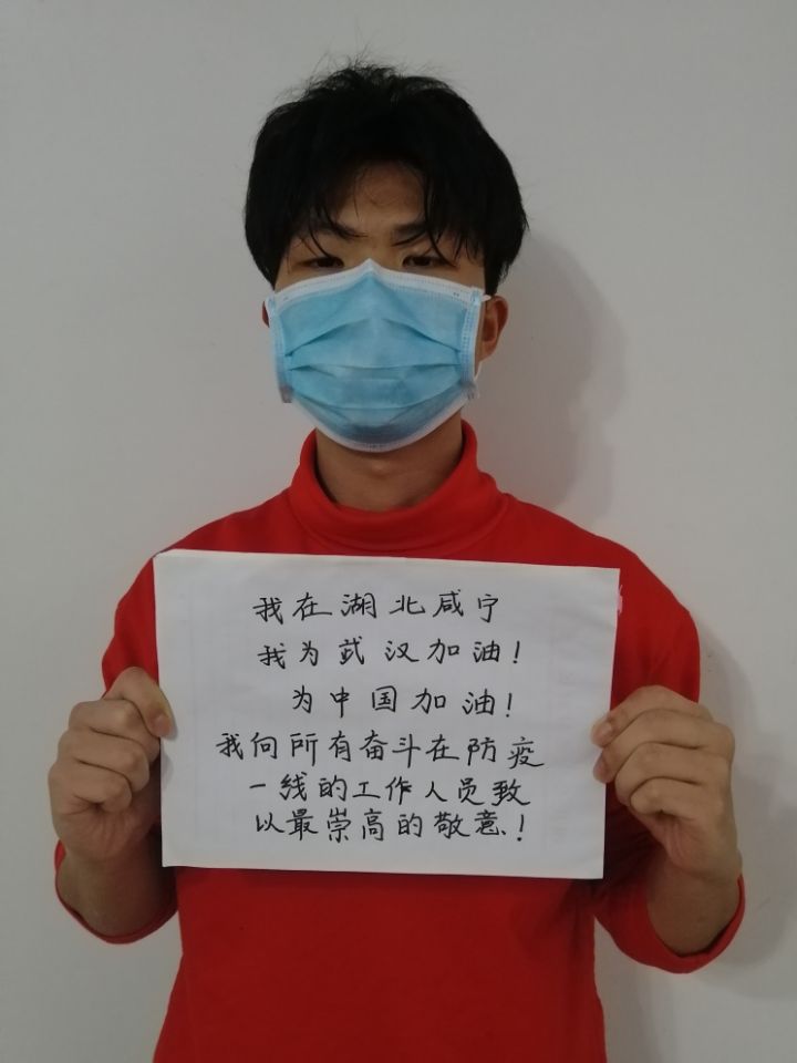 通信191班团支书宫瑞棋:我在江苏南京为武汉加油!为中国加油!向所有奋战防疫一线的医务工作者和工作人员致敬!希望所有的朋友能够平安健康!让我们齐心协力早日赢得这场战役!