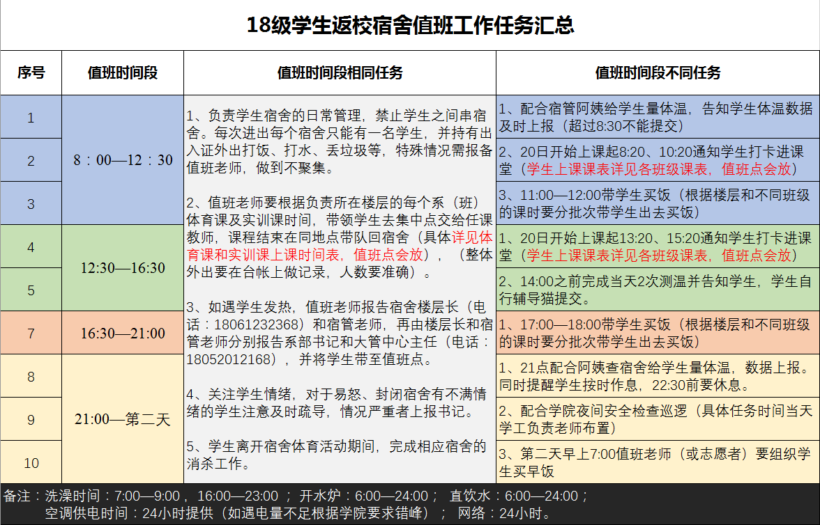 辅导员值班现场布置工作: 详细任务分解: 日夜坚守的老师: 带学生去就餐: 定时测温: 关心学生、嘱咐学生: 为了帮助学生调整好心态,尽快适应校园学习生活,QQ班级群成为主战线,辅导员24小时在线,积极宣传科学防疫知识。提醒同学戴口罩、勤洗手、常通风,不扎堆,增强防护意识,严格落实晨、午、晚检制度、日报制度、就餐制度、线上教学制度等,同时还利用网络,密切关注学生心理动态。