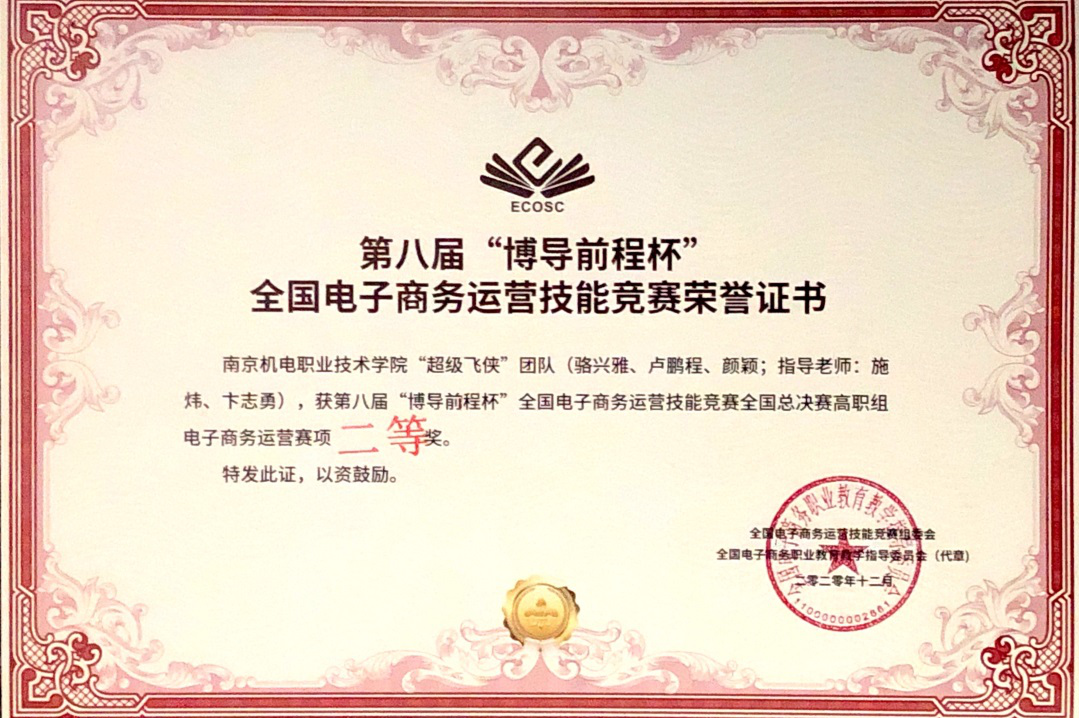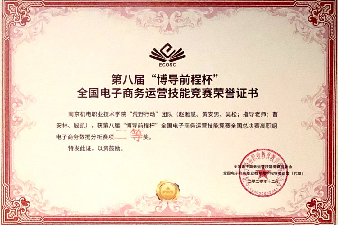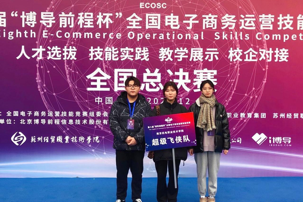 2020年12月29日,第八届“博导前程杯”全国电子商务运营竞赛决赛在苏州经贸职业技术学院举行。乐玩体育电子商务运营“超级飞侠队”团队(骆兴雅、卢鹏程、颜颖;指导老师:施炜、陈洁)以及电子商务数据分析“荒野行动队”团队(赵雅慧、吴松、黄安男;指导老师:殷凯、曹安林)双双荣获高职组全国总决赛二等奖。