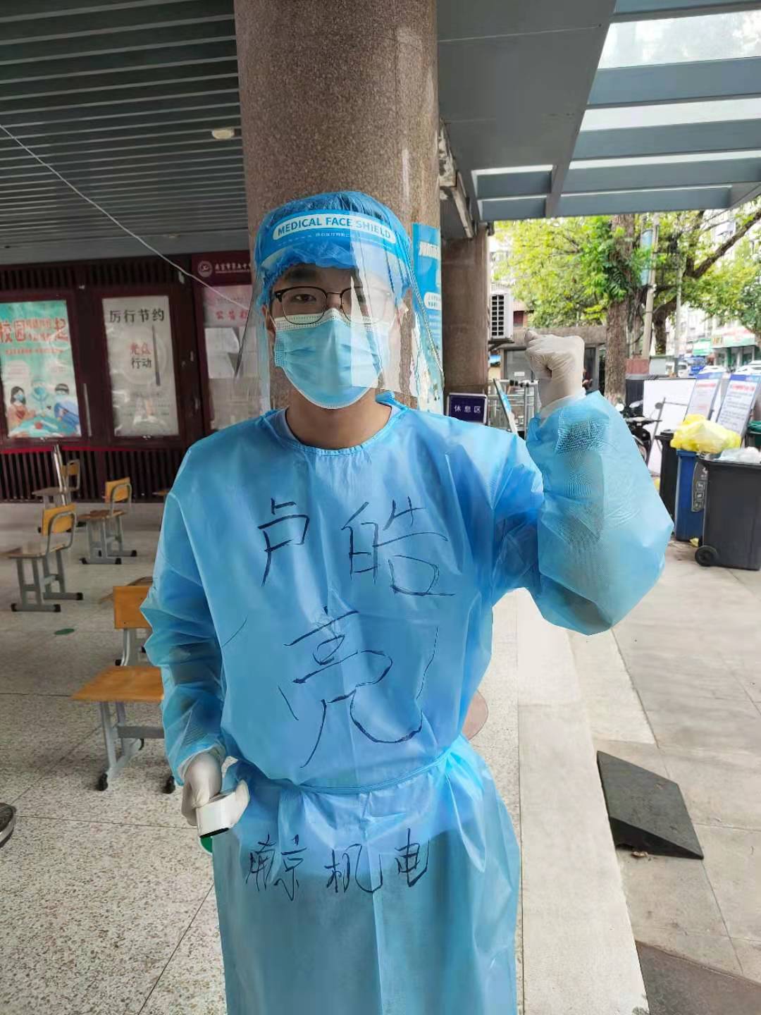 在此期间,目睹那些志愿者在疫情防控一线上挥汗如雨,我深受触动,下定决心要为疫情防控献出自己的一份力量。于是,我光荣的成为了一名志愿者。我深知这不仅是一份责任,更是一份担当,一个属于新时代青年的担当,一个属于南京机电学子的担当。在岗位上,我一天奔波了五个流动检测点,每到一个检测点就要穿戴好隔离服,做好全面的病毒消杀,在每个流动核酸检测点登记黄码和经停机场人员的单独采样信息是我的职责,光是一上午我就登记了整整两百个检测样本,虽然天气炎热,我也没有一丝怨言。