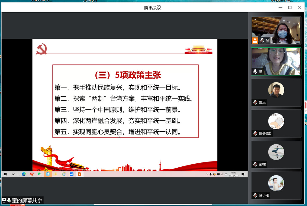 4月12日下午,根据党的二十大主题宣传教育活动工作方案的安排,信息工程系党支部依托腾讯会议平台开展了线上政治理论学习,本次学习的主题是坚持“一国两制”、推进祖国统一。支部书记吴伟萍主持会议,支部全体党员及普通教职工参加学习。