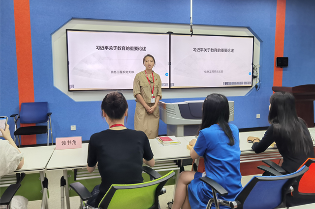 6月1日,信息工程系党支部支委班子召开主题教育第一期读书班,支委班子成员及党小组组长参加学习。信息工程系党支部纪律委员、副主任刘娴领学精读习近平总书记关于教育的重要论述的内容。支委班子成员及两位党小组组长结合工作实际,深入交流研讨。