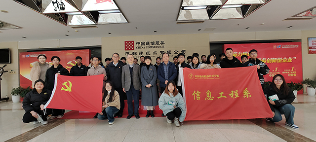 在总经理助理潘志强、人力资源部主任王亚东等高管的陪同下,信息工程系师生一行参观了该公司办公区和企业文化区,深入了解了中邮建技术有限公司的党建成果和企业文化。随后,双方在公司会议室召开了研讨会,就党建引领校企合作、人才培养、专业设置、实习实训等方面进行了深入的交流。