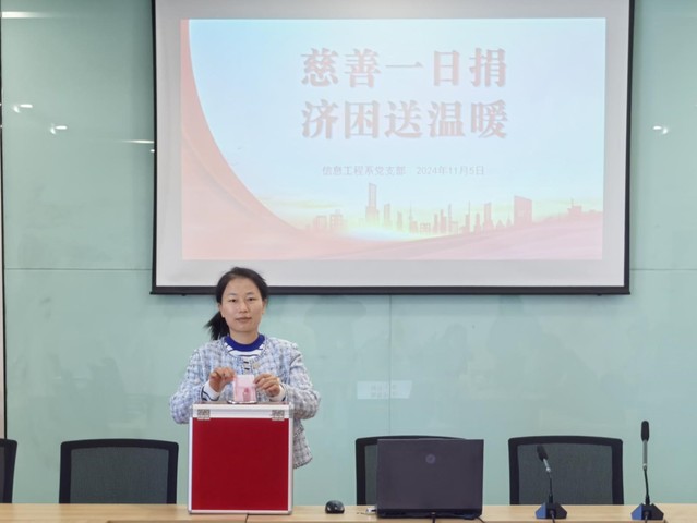 为深入贯彻落实党的二十大精神以及习近平总书记关于慈善工作的重要讲话精神,大力弘扬扶贫济困、友爱互助这一中华民族传统美德,信息工程系积极响应南京市开展 2024 年“慈善一日捐、济困送温暖”活动号召,于11 月5日下午在弘德楼西塔602会议室组织开展了“慈善一日捐・济困送温暖”捐款活动。本次活动由党支部书记胡枫主持,信息工程系全体教职工参加。