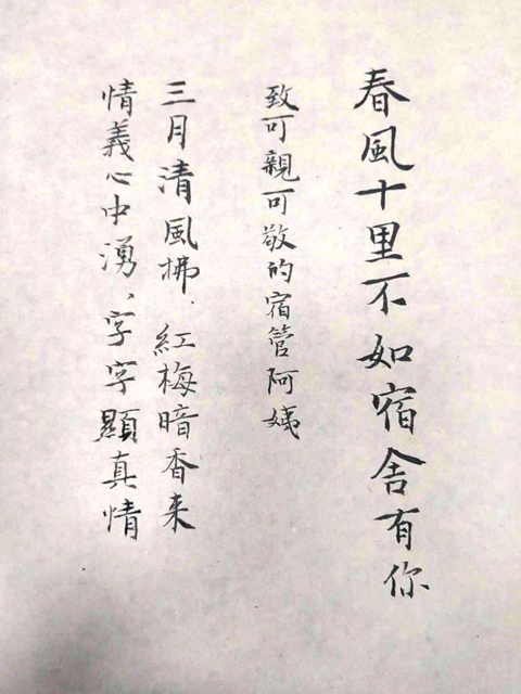 此外,二栋、三栋、四栋以及六栋宿舍楼的学生们,为了感谢阿姨平日里无微不至的照顾,采用视频的形式,大声说出对阿姨的爱。画面虽短,却掩不住大家浓浓的情义!作为大二学子,五栋、七栋自然也不甘落后。他们与阿姨已经朝夕相处了很久,更是有很多言语想要跟阿姨诉说。在这个特别的节日里,他们将千言万语化作坚定的笔触书写下来。“春风十里不如宿舍有你”字字有力,字字动情!