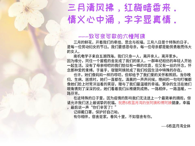 三月清风拂,红梅暗香来。情义心头涌,字字显真情。三月的鲜花,带着我们的牵挂与祝福盛开。今天是“三八”妇女节,祝南京机电所有的女神们节日快乐!在这个特殊的节日里,学生宿舍管理委员会携宿舍区全体学生向宿管阿姨表白:因为有你,温暖如家!
