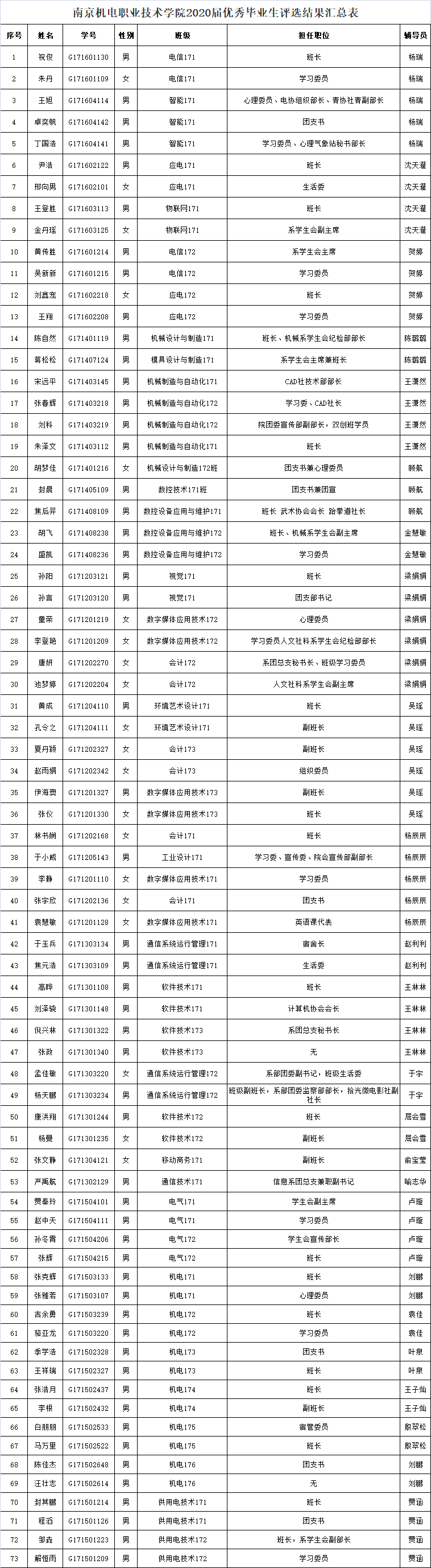 根据南机电院 学[2]号《关于评选2020届优秀毕业生的通知》,经班级评选,系部审核,学工处复核,决定拟推荐以下73名同学为2020届乐玩体育优秀毕业生。现予以公示,公示时间:2020年6月24日—2020年6月30日。联系人:宁燕,电话:025-84190262,18061230078。