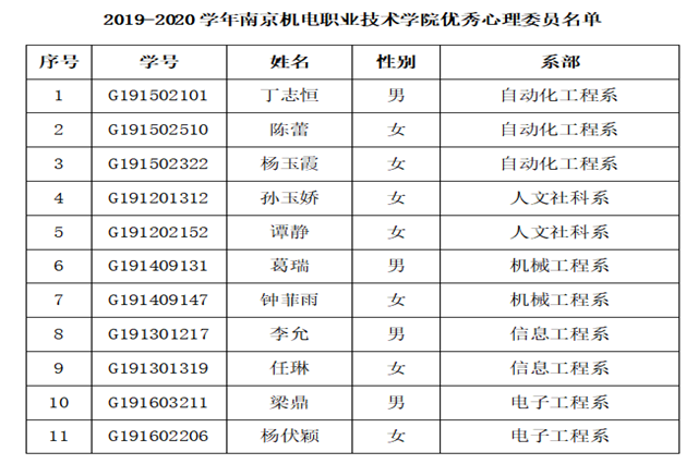 根据乐玩体育《优秀心理委员评选细则》规定,经自主申报,各系心理气象站推荐,学生工作处核准,学校审批,决定授予丁志恒等11名同学“优秀心理委员”的荣誉称号。