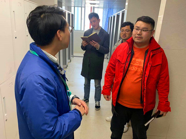 傅处长一行在我校学工处大管中心主任张进宝的陪同下,走访参观了我校学生宿舍、洗衣房、淋浴房、开水间、一站式服务大厅等服务学生场所,参观过程中张主任向其介绍了我校学生宿舍管理模式、楼层长培养、晚查房等具体事宜。近一小时的现场调研参观后,我校学工处处长张宝中在星梦馆206就我校新校区建设、学生宿舍宿内装设计、家具的选购等方面做了详细的交流。傅处长对我校学生宿舍管理工作表示充分的认可,并对我校整体建筑风格设计表示高度的赞赏。