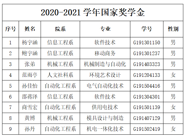 根据《教育部财政部关于印发<本专科生国家奖学金评审办法>的通知》(教财函〔2019〕105号)以及《江苏省学生资助资金管理办法》《江苏省学生资助管理实施细则》《省教育厅关于做好2021年普通高校国家奖学金有关工作的通知》苏教助函〔2021〕12号文的相关精神。我院认真落实国家奖学金评审相关细则,各系部通过召开系部国家奖学金评审小组会议,认真贯彻落实国家奖学金评定要求,本着公开、公正、公平的原则,经学生个人申报,班级评议通过,上报系部评议小组,经系部评议审核通过,公示完毕。正式上报学院大学生资助管理中心,经学院大学生资助管理中心复审,召开学院2020-2021学年国家奖学金评审会,拟确定9位同学为乐玩体育2020-2021学年国家奖学金获得者。