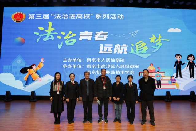 为加强我校学生的法治教育,提高学生自我保护意识,营造良好的校园法治氛围,同时实施“宪法卫士”2021年行动计划,南京市人民检察院第三届“法治进高校“活动走进我校。南京市高淳区检察院分管领导汪新翠、未成年人检察工作负责人孔瑶婷、高淳区检察院关工委常务副主任李祥志、武三头、高淳区青联委员会副主席陈思洁、学校学工处副处长杨小波出席活动,我校近200名学生代表参加。活动由学工处钱莉娇老师主持。