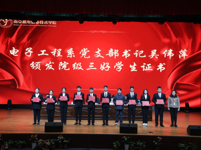 电子工程系党支部书记吴伟萍为学校三好学生获奖者代表颁奖。