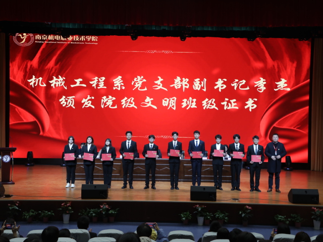 机械工程系党支部副书记李杰为学校文明班级获奖者代表颁奖。