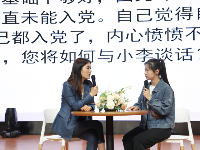 谈心谈话环节,在学生助演的配合下,通过情景再现的形式,辅导员与学生们进行面对面的深入交流,谈话内容涉及思想政治教育、学风建设、党团建设、日常管理等多个方面。辅导员情理兼顾、平等尊重和合理引导,基于情境和学生特点给予个性化指导,晓之以理、动之以情。谈心谈话比赛成为了师生心与心交流的别样舞台,充分展示了辅导员对学生成长成才规律的把握和教育引导能力。