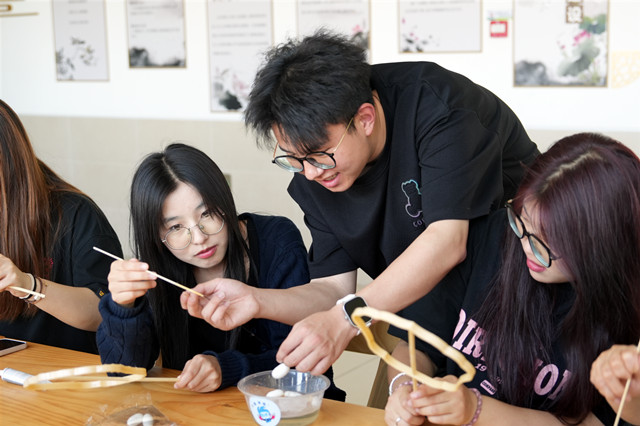 一把蚕丝团扇,执扇轻摇,摇曳起东方之美,将现代美学与古老的非遗体验相结合。5月20日,乐玩体育20名学生在“一站式”学生社区共享空间,开启了一段“体验桑蚕文化领略丝绸之美”非遗蚕丝扇手工制作的奇妙之旅。