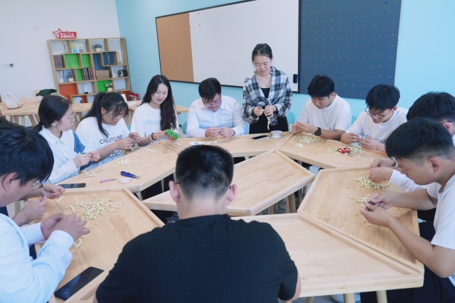 入座后,在工作人员的细心讲解和示范下,同学们认真学习,了解每项步骤后,积极发挥创意,从如何穿插花瓣到丝带样式选择,在彼此间的指导帮助中,同学们渐渐地找到了制作的小窍门,专心致志地完成择花、绑丝带、串花等一系列工序,发挥自己的创造力,制作出了属于自己的独特的茉莉花手串,将一朵朵含苞待放的茉莉花用丝带缠绕成腕间的一抹风景。活动现场欢声笑语,千丝万缕的丝线和灵动的手指交织出了青春的美丽图景。
