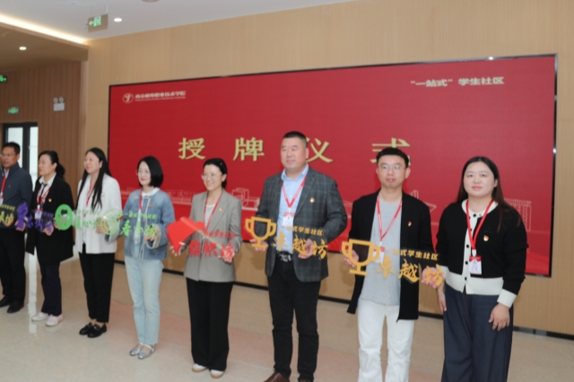 在师生代表共同见证下,机关三党支部书记吴伟萍、信息工程系党支部书记胡枫、机械工程系党支部副书记李杰、电子工程系党支部副书记陈雪、自动化工程系党支部副书记杨军、人文社科系党支部副书记叶绘共同为“一站式”学生社区三区揭牌。