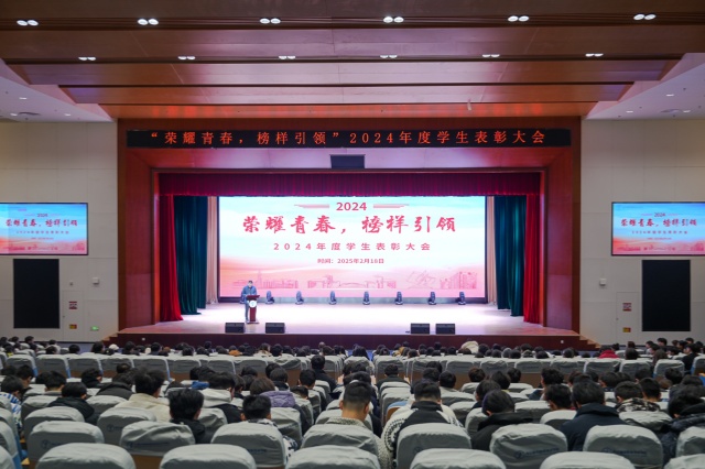 为引导青年学生坚定理想信念,勤奋刻苦学习,进一步树立典型、表彰先进,不断提升学校思想政治工作质量,充分发挥先进典型的示范和引领作用,2025年2月18日下午,学校2024年度“荣耀青春 榜样引领”学生表彰大会在青春剧场举行。党委副书记、副校长赵学洪出席会议,各系党支部书记、学工干事、全体辅导员、学生工作处全体老师、2024年度获奖学生及500名在校学生代表参加。大会由学生工作处处长张宝中主持。