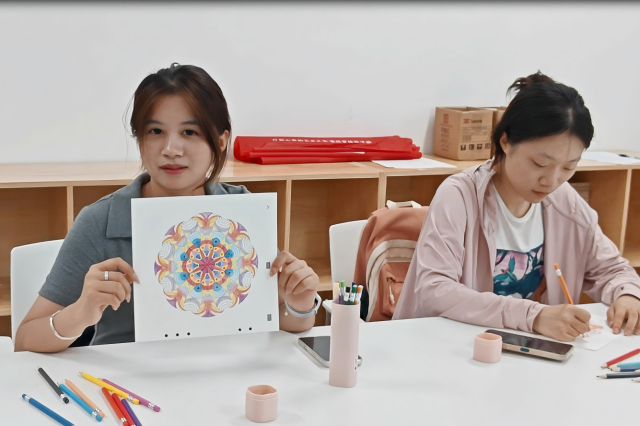 伴随着舒缓的呼吸引导,同学们进入曼陀罗创作实践阶段。螺旋的纹路,对称的图案,丰富的色彩,此刻都成为心灵的代言。在“分享与升华”环节,同学们以小组为单位展开讨论。有人坦言:“过去总逃避负面情绪,今天发现直面它反而能释放压力。”还有人在欣赏他人作品时感叹:“原来每个人的内心世界都如此独特而美丽。”