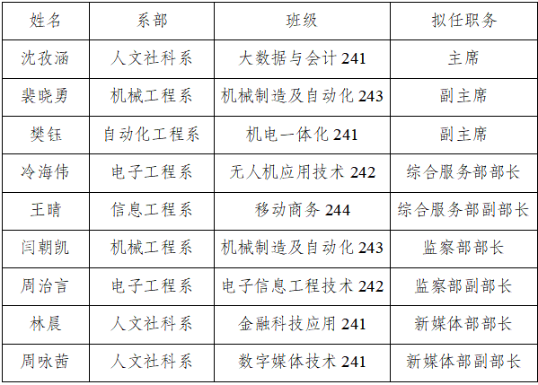 根据《乐玩体育“一站式”学生社区学生自我管理委员会章程》相关规定,为切实加强学生干部队伍建设,学生工作处于2025年6月开展了第一届学生自我管理委员会学生干部选拔工作,经学生自主报名、组织推荐、资格审查、竞选答辩、综合考察等环节,选拔产生了拟任人选,为提高学生干部选拔的透明度,现将拟任人选的名单予以公示。