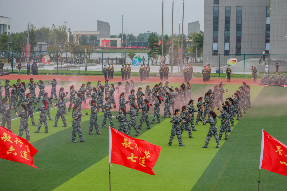 大会在庄严的国歌声中拉开帷幕。随后举行的军训成果汇报展示中,各营方队以昂扬的姿态依次通过主席台。国旗护卫队步伐铿锵,彰显护卫国旗的使命担当;信息工程系“奋进营”将代码的严谨融入队列规整;机械工程系“卓越营”展现工科学子的精工品质;自动化工程系“敏行营”演绎智能时代的精准协同;人文社科系“看齐营”彰显人文底蕴与军人品格的交融;电子工程系“慎行营”展现电子人的严谨专注。同学们整齐的步伐、响亮的口号,充分展现了军训取得的丰硕成果。