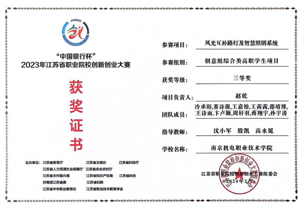 2024年2月26日,省教育厅下发了《关于公布“中国银行杯”2023年江苏省职业院校创新创业大赛获奖名单的通知》,2023年全省职业院校创新创业大赛圆满落幕。经校级初赛、省级复赛和省级决赛,自动化工程系赵乾等同学参赛的“风光互补路灯及智慧照明系统”项目获评省级三等奖。