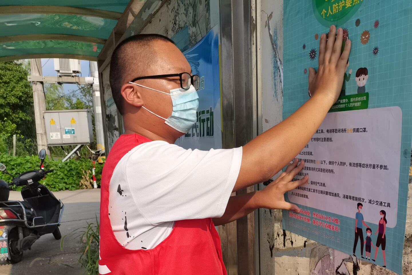 机电一体化技术202班的倪晨在泰州市三太村做志愿者,他负责张贴防疫的宣传海报。天气炎热,他也依旧坚持在岗位上,他说:疫情出现反弹,作为新时代青年,我们应该尽自己的一份力量去做一些对社会有益的事,我加入志愿者的队伍,即便是张贴海报这样简单的工作,只要能为抗疫贡献一份力量,哪怕再微小,也足够了。