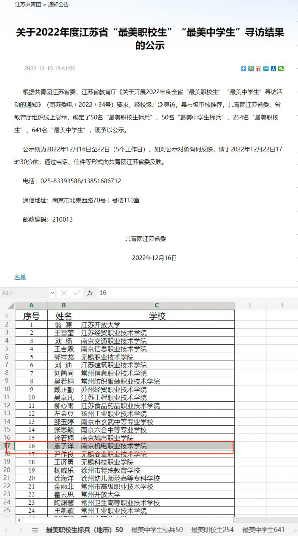 由共青团江苏省委、江苏省教育厅共同举办的2022年度全省“最美职校生”寻访活动结果揭晓,我校自动化工程系袁子洋同学荣获“最美职校生标兵”荣誉称号。